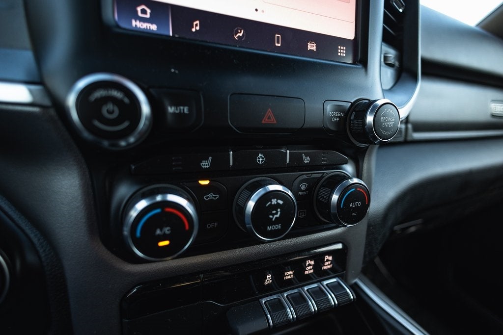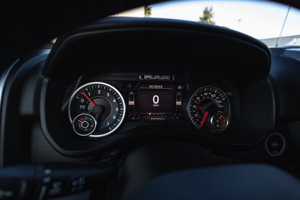 Safety is a priority in this Ram 1500, featuring standard electronic stability control, direct tire pressure monitoring, and comprehensive airbag coverage, including front and side airbags for all rows. The standard backup camera and LED headlamps with daytime running lights enhance visibility and safety, making it a reliable choice for families and adventurers alike.